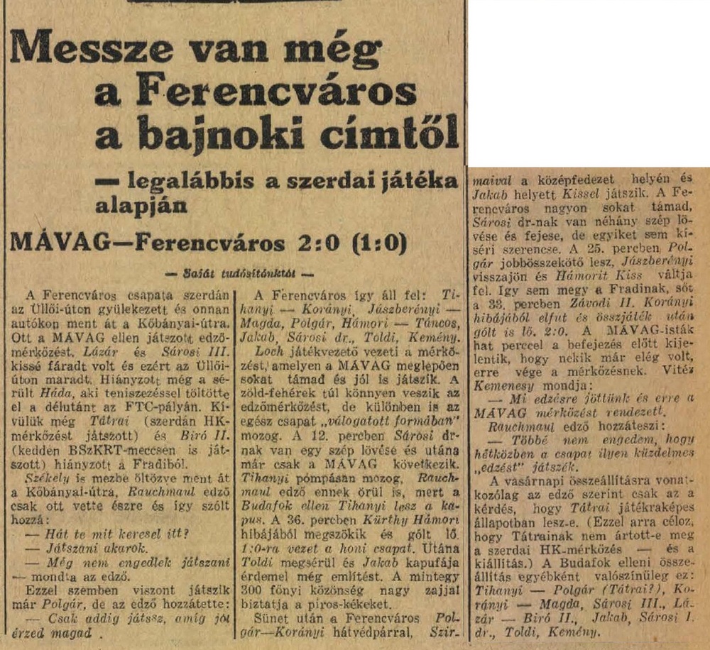 1938.V.18. MÁVAG – Ferencváros 2:0 (edzőmérkőzés)
