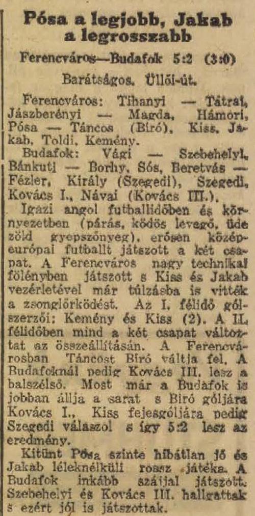 1938.X.2. Ferencváros – Budafok 5:2 (edzőmérkőzés)