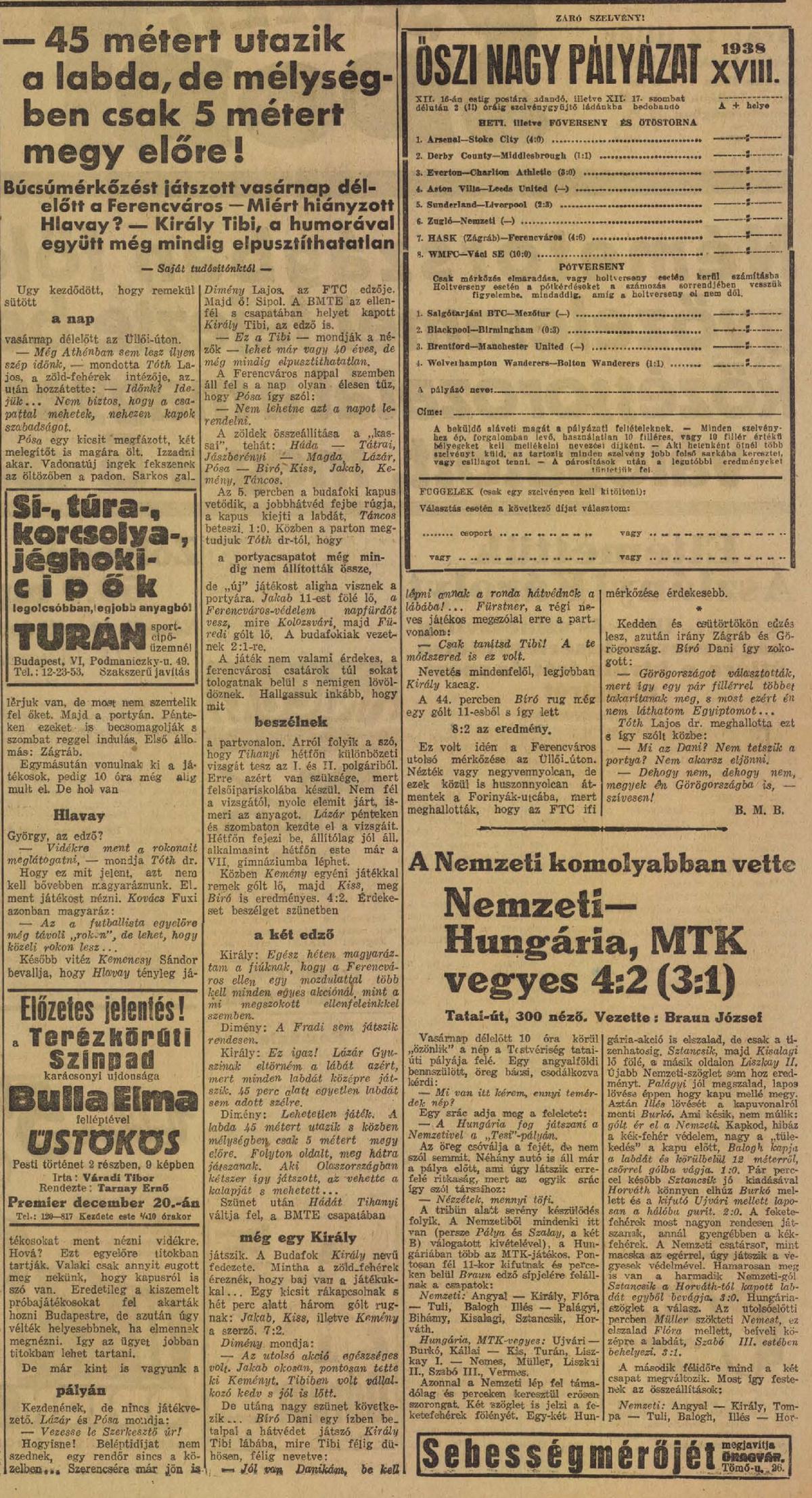 1938.XII.11. Ferencváros – BMTE 8:2 (edzőmérkőzés)