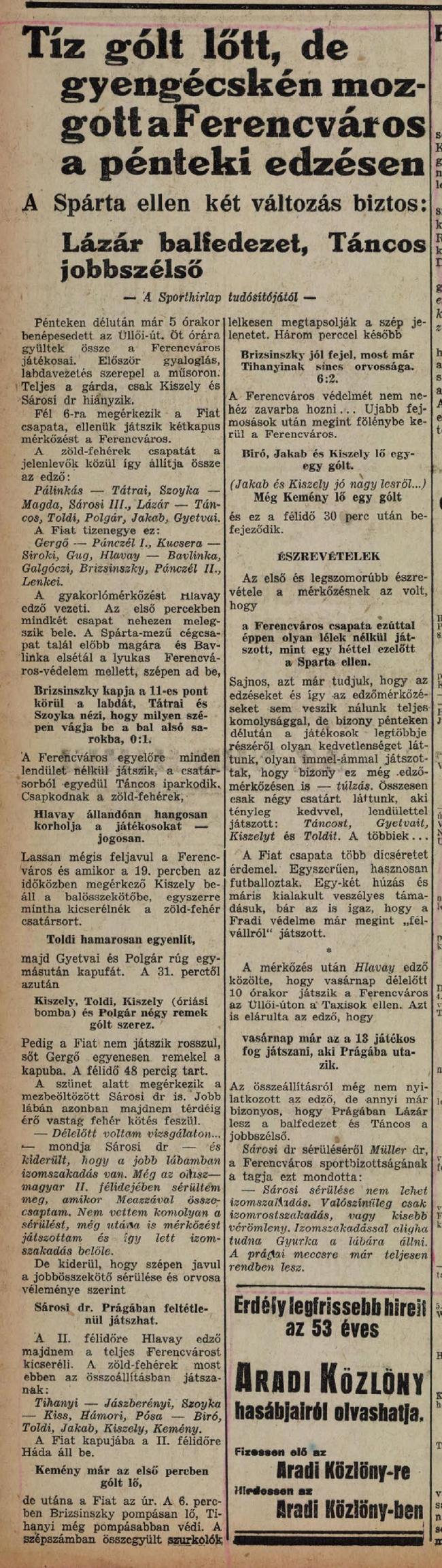 1939.VI.23. Ferencváros – FIAT 10:2 (edzőmérkőzés)