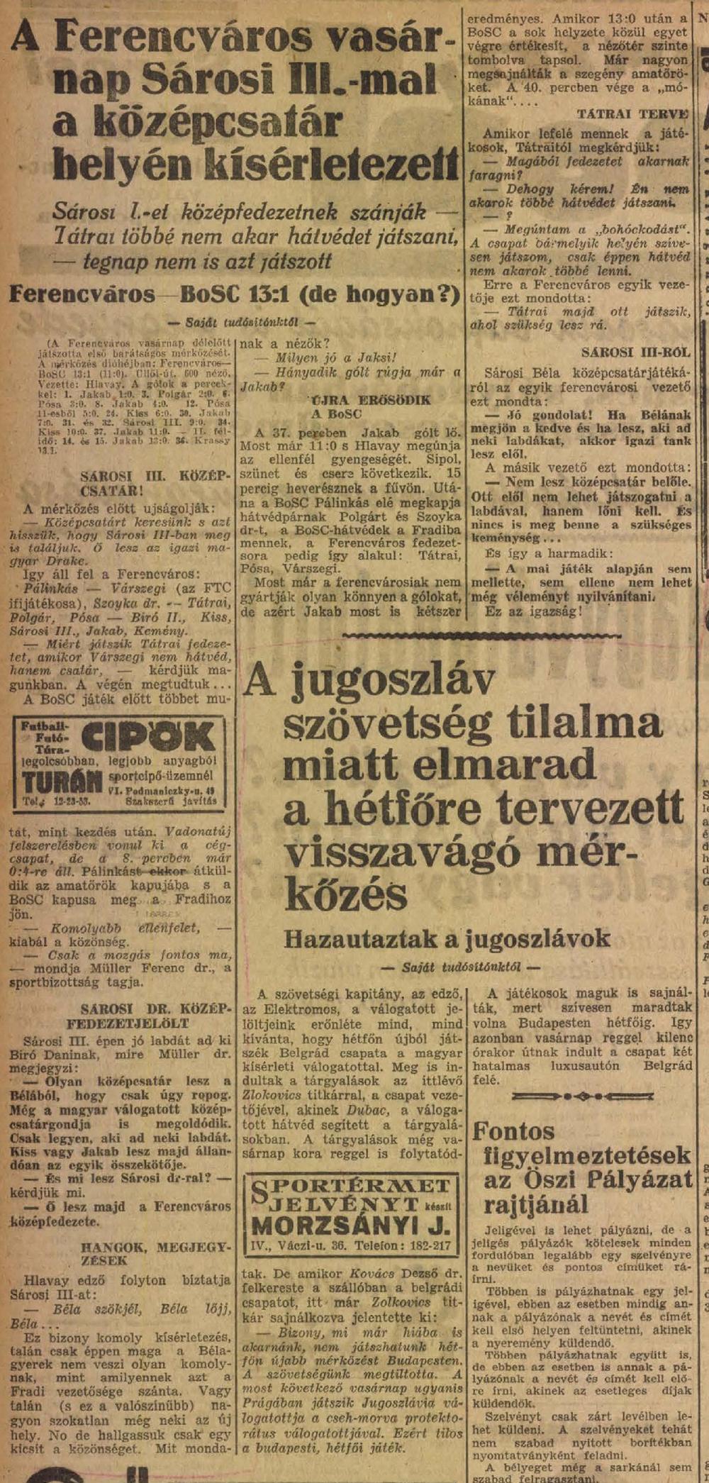 1939.VIII.20. Ferencváros – BoSC 13:1 (edzőmérkőzés)