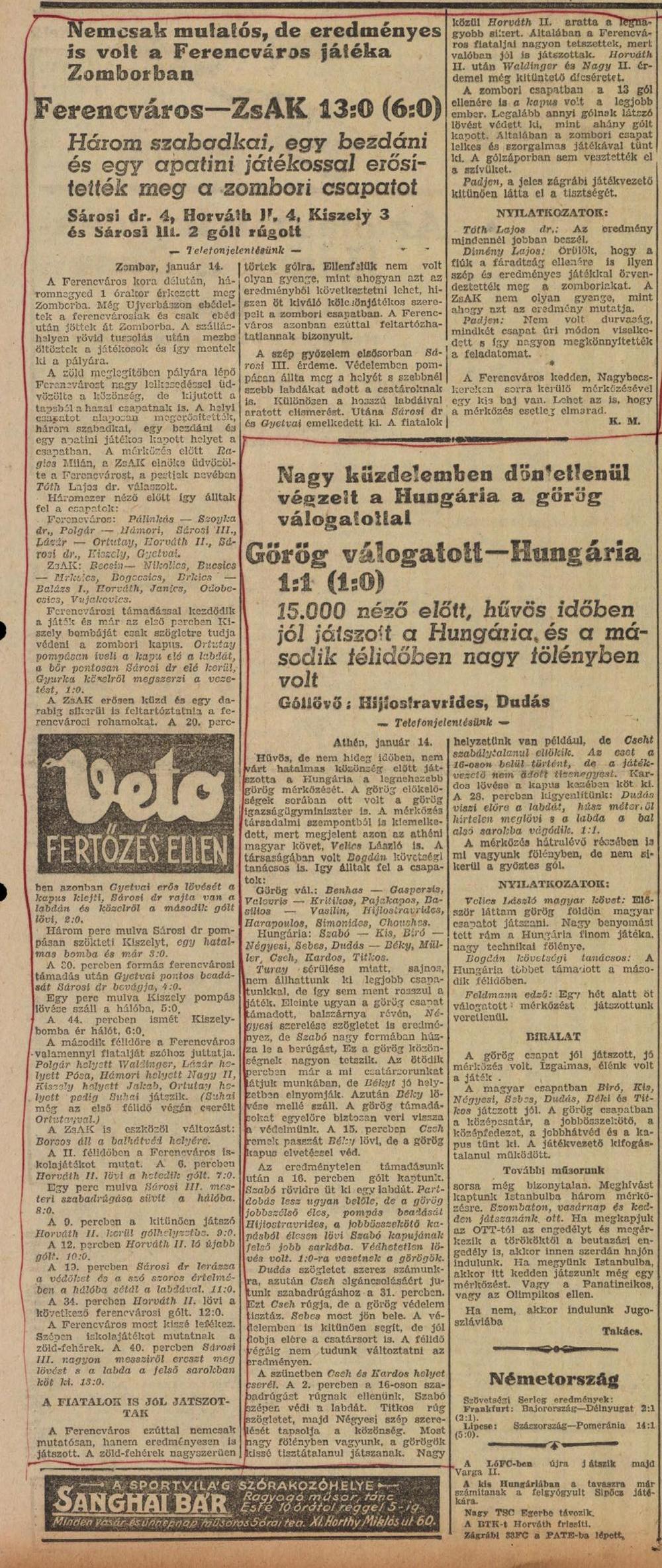 Sárosi dr. 4, Horváth II. 4, Kiszely 3 és Sárosi III. 2 gólt rúgott