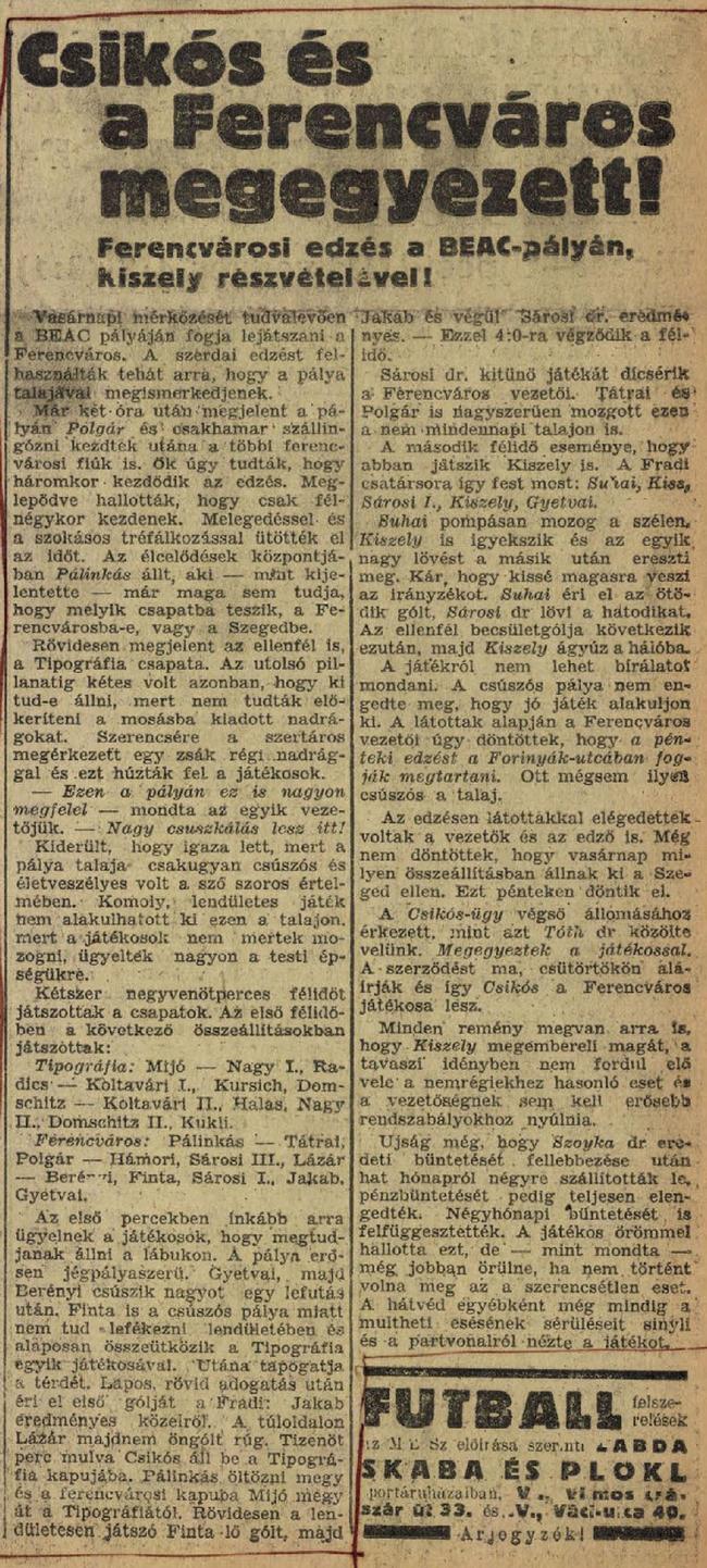 1940.II.21. Ferencváros – Tipográfia 7:1 (edzőmérkőzés) Közzétéve: 2009. február 9. hétfő | Szerző: K@rcsi Csikós és a Ferencváros megegyezett! Ferencvárosi edzés a BEAC-pályán, Kiszely részvételével! Vélemény, hozzászólás? Válasz megszakításaAz e-mail címet nem tesszük közzé. A kötelező mezőket * karakterrel jelöltük Hozzászólás * Név * E-mail cím * Honlap Δ