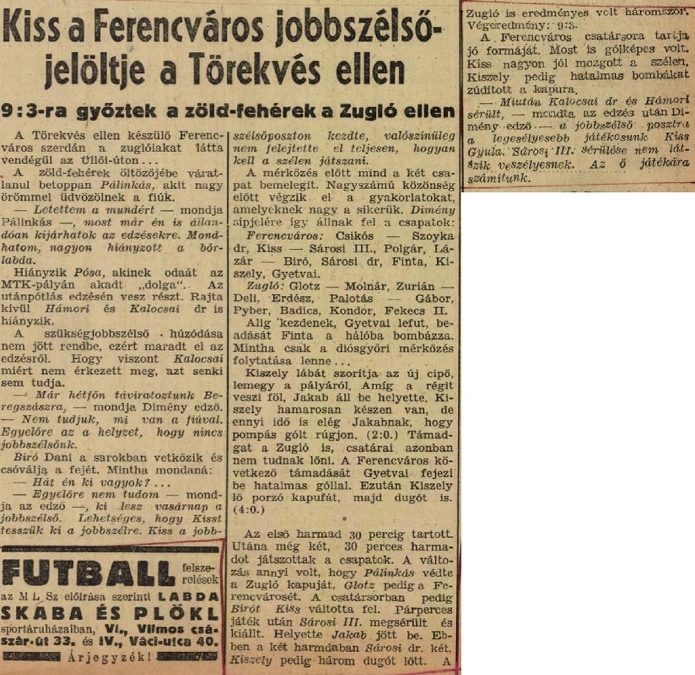 1940.IX.11. Ferencváros – Zugló 9:3 (edzőmérkőzés)