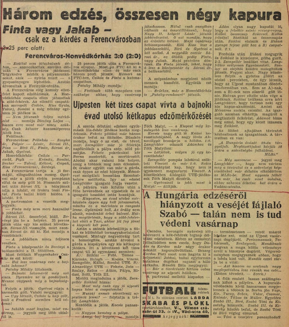 1940.V.29. Ferencváros – Honvédkórház 3:0 (edzőmérkőzés)