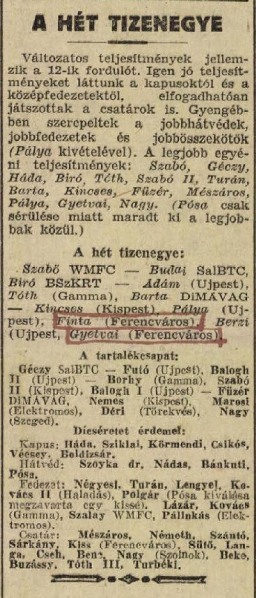 „A Kispest majdnem megállí­totta diadalútjában a Ferencvárost” – ebben a mondatban meg benne van minden. Benne van az 1940/41-s bajnokság feszültsége, de benne van a jelen reménye is. A Dózsa elleni sokáig emlékezetes győzelmünk után vasárnap Kispesten kell folytatni a „diadalútat”. Ennek fényében meg a választásom is érthető, még akkor is, ha ezzel megszegve a „szabályokat”, mégis csak egy olyan találkozót választottam, mellyel a jelent próbálom „befolyásolni”. Ami természetesen lehetetlen, főleg egy 73 évvel ezelőtti találkozó felidézésével, de néha az ember óhaja erősebbnek akar látszani, mint a lehetősége.