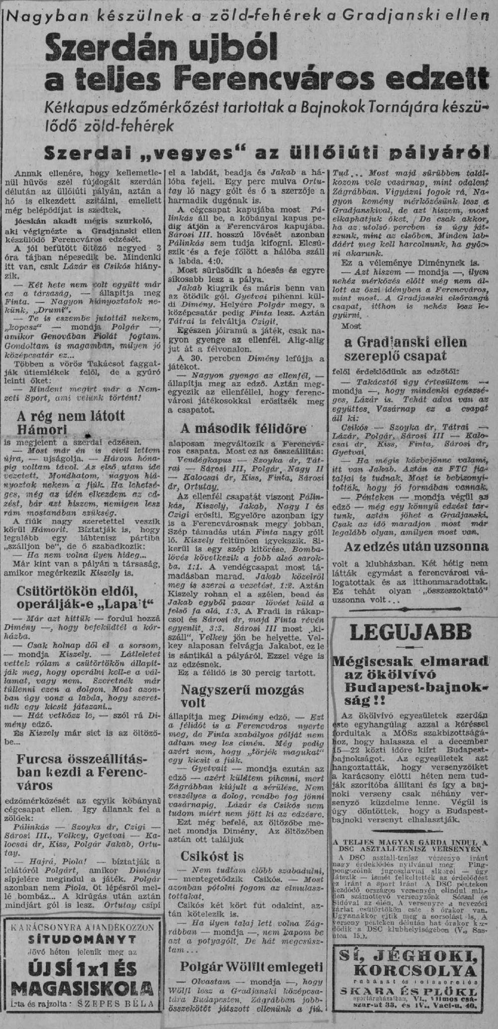 1940.XII.11. Ferencváros – (Kőbányai cégcsapat) 8:3 (edzőmérkőzés)
