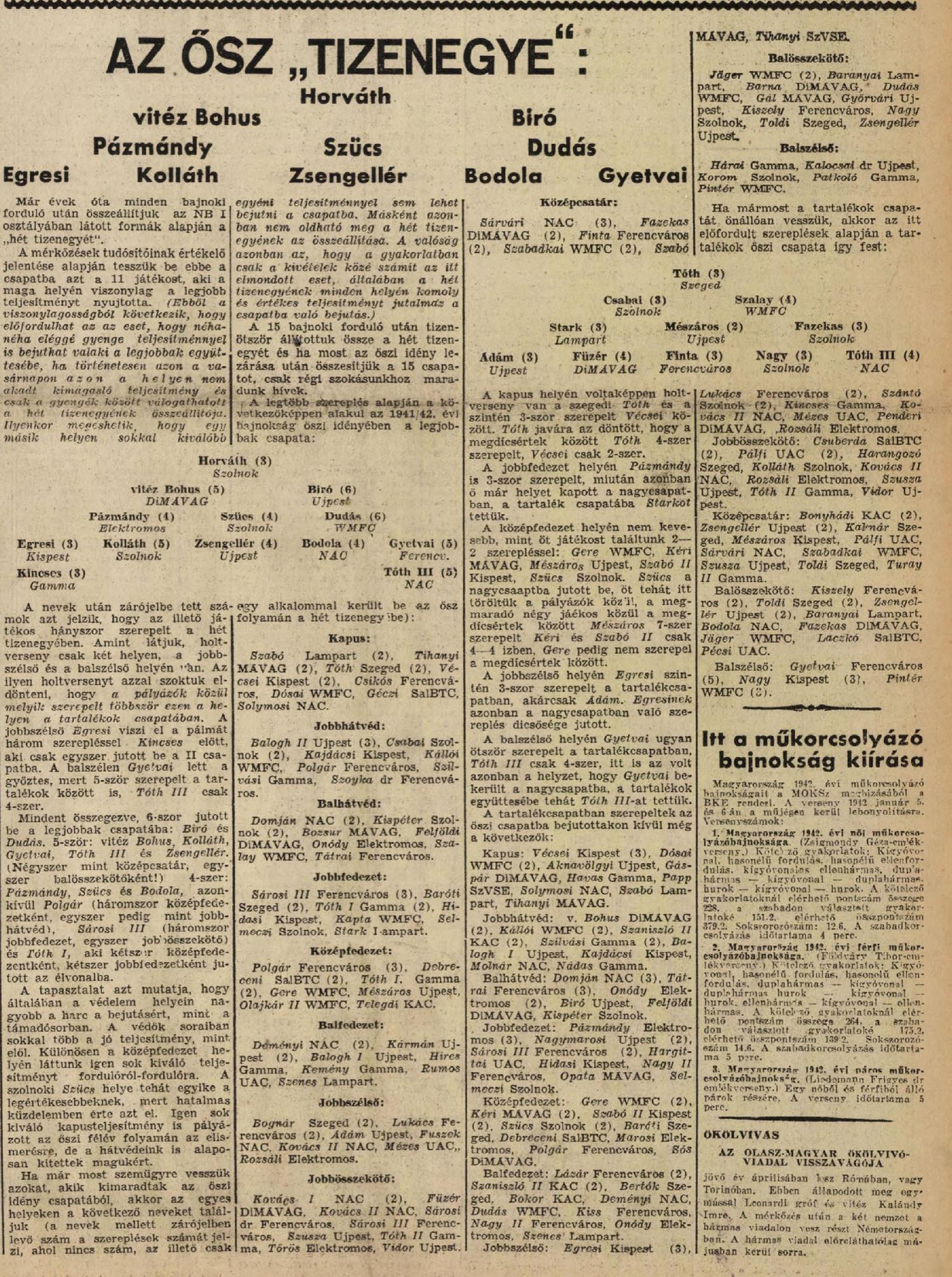Kategória: Posztonkénti rangsor (NS) | Címke: "a hét tizenegye", 1941/42, Csikós Gyula, Finta Károly, Fischer (Füstös) János, Gyetvai László, Jakab László, Kiss Gyula, Kiszely István, Lázár Gyula, Lukács Ede, Nagy II. András, Pálinkás József dr., Polgár Gyula, Pósa Béla, Rudas Ferenc, Sárosi György dr., Sárosi III. Béla, Szoyka Kornél dr., Tátrai Sándor, Waldinger László