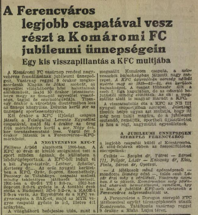 1941.V.4. Jubileumi mérkőzés, KFC – Ferencváros 2:8 Közzétéve: 2009. február 10. kedd | Szerző: mjozef22 A Ferencváros szép játékkal győzött Komáromban Kilenc ferencvárosi játékos küldöttségben kérte Pataki Mihályt, hogy vegye át újra a Ferencváros sportbeli irányítását Vélemény, hozzászólás? Válasz megszakításaAz e-mail címet nem tesszük közzé. A kötelező mezőket * karakterrel jelöltük Hozzászólás * Név * E-mail cím * Honlap Δ