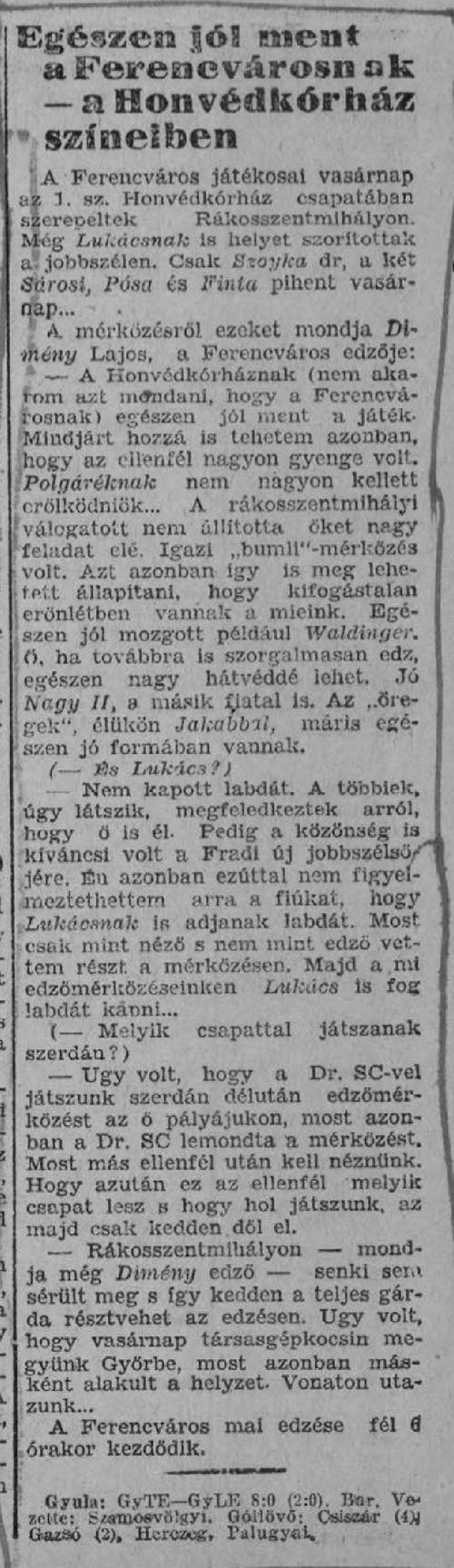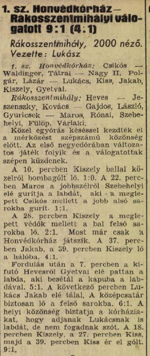 1941.VII.27. Rákosszentmihályi válogatott – 1. sz. Honvédkórház 1:9 (edzőmérkőzés)
