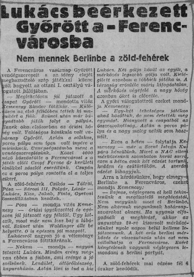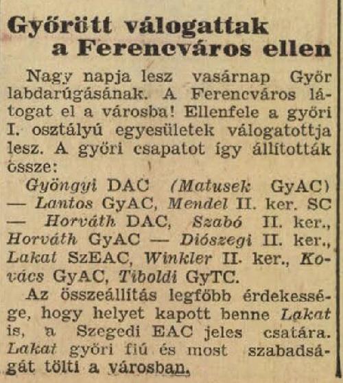 1941.VIII.3. Győri I. osztályú válogatott – Ferencváros 1:9 (edzőmérkőzés)