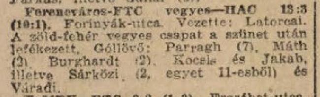 1941.X.26. Ferencváros – HAC 13:3 (edzőmérkőzés)