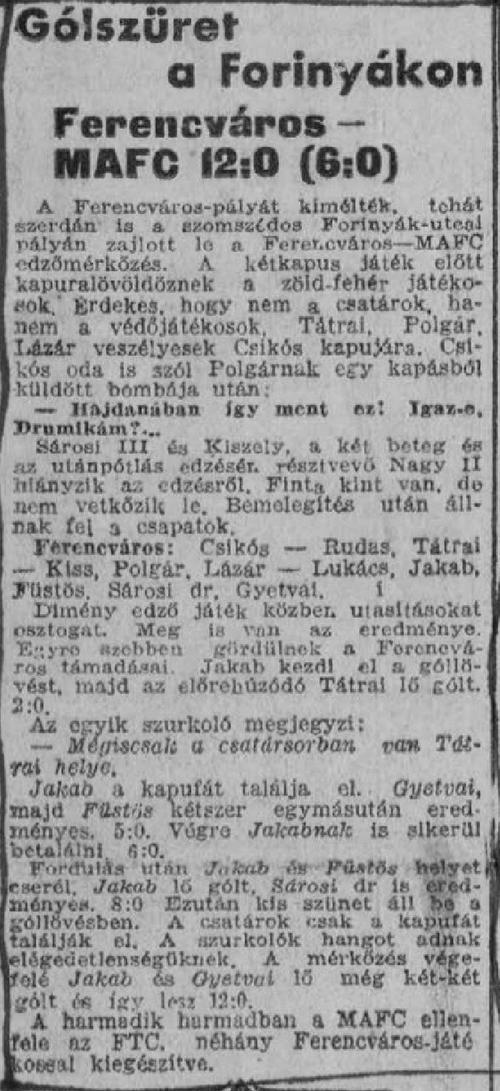 1942.III.18. Ferencváros – MAFC 12:0 (edzőmérkőzés)