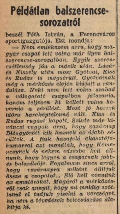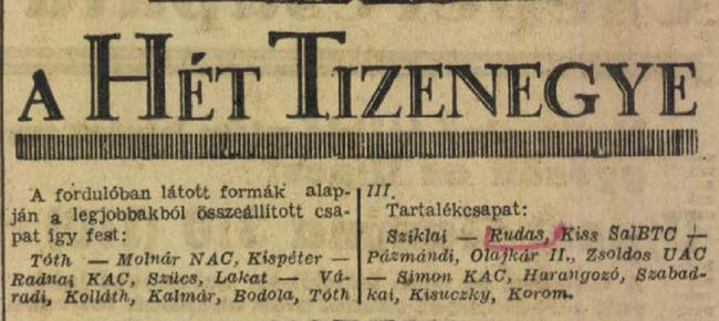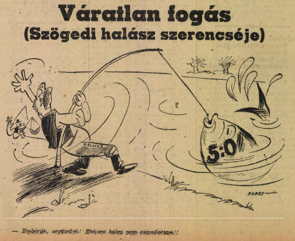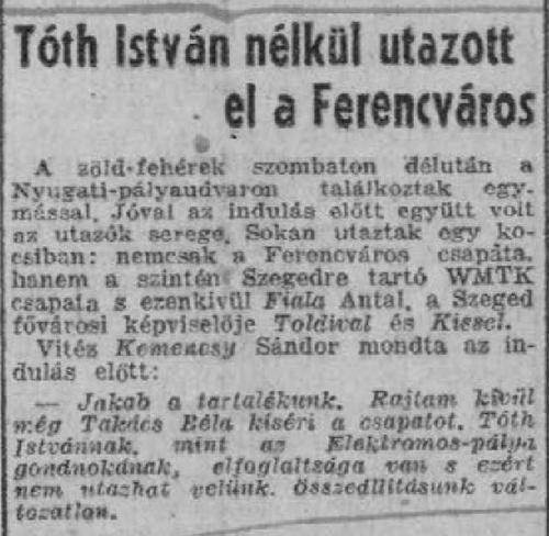 A Fradit 5:0-ra legyőző Szeged csapata. Állnak, balról: Gyuris, Kalmár, Harangozó, Toldi, Kis-Kalkusz, Báló, Tóth. Guggolnak: Bognár, Baróti, Lakat, Szabó.