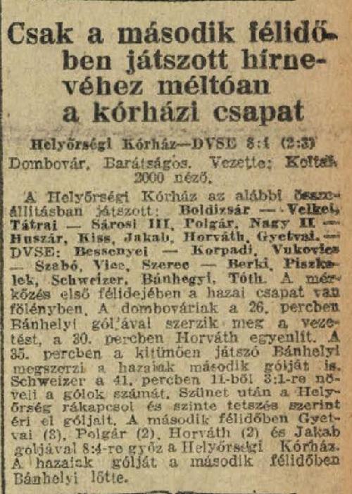 Dombóvárott vendégszerepel vasárnap a Honvéd Helyőrségi kórház csapata a következő összeállításban: Boldizsár — Velkei, Tátrai — Sárosi III, Polgár, Nagy II — Lukács, Sárosi dr. Jakab, Kiss, Gyetvay.
