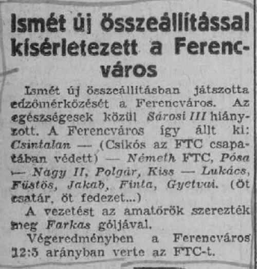 1942.VIII.26. Ferencváros – FTC 12:5 (edzőmérkőzés)