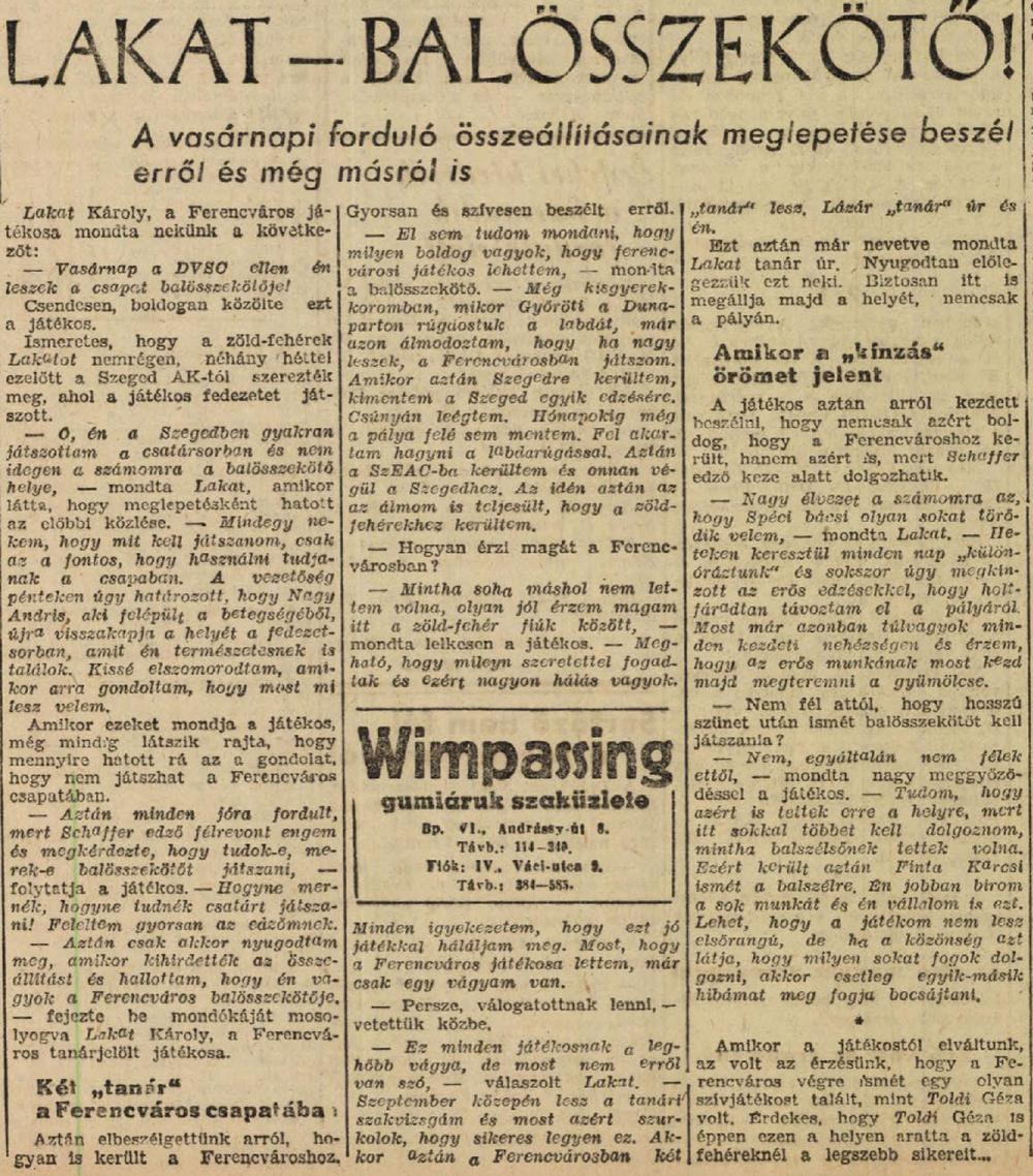 Annak ellenére, hogy 1943-t í­runk és a szeptemberi ősz is kellemes időt varázsolt a pálya köré, aránylag kevesen, csak tí­zezren voltak kí­váncsiak a DVSC elleni első bajnoki összecsapásra. A Fradi is kényelmesen készülődött, Lakat Károlyon kí­vül mindenki nyugodtan várta a kezdést. A fiatal és nagyon tehetséges fedezet, bár bajnoki mérkőzésen csak most lépett másodszor pályára a Fradi első csapatában, nem a mérkőzésdrukk, hanem az újonnan kapott poszt miatt idegeskedett egy kicsit. Eddig főleg jobb oldali fedezetként játszott, de ezen a mérkőzésen Schaffer Alfréd egy sorral előrébb küldte a pályára, ráadásul a balösszekötő helyén kellett bizonyí­tania, hogy a góllövéshez is ért.