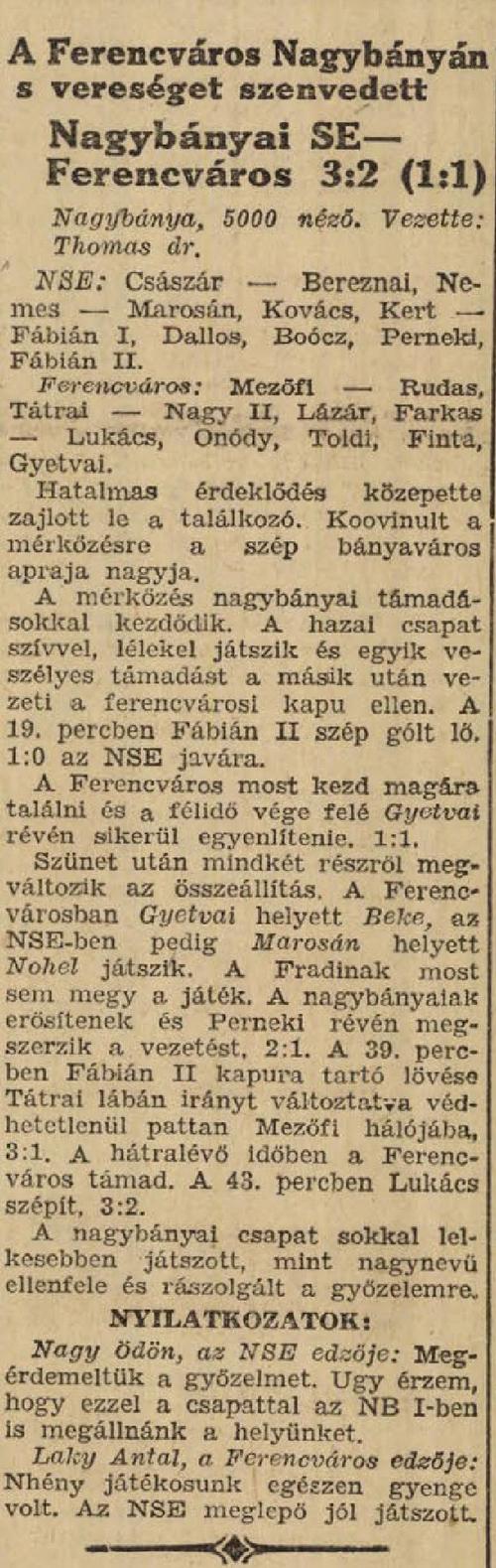 1943.V.16. Nagybányai SE – Ferencváros 3:2 (edzőmérkőzés)