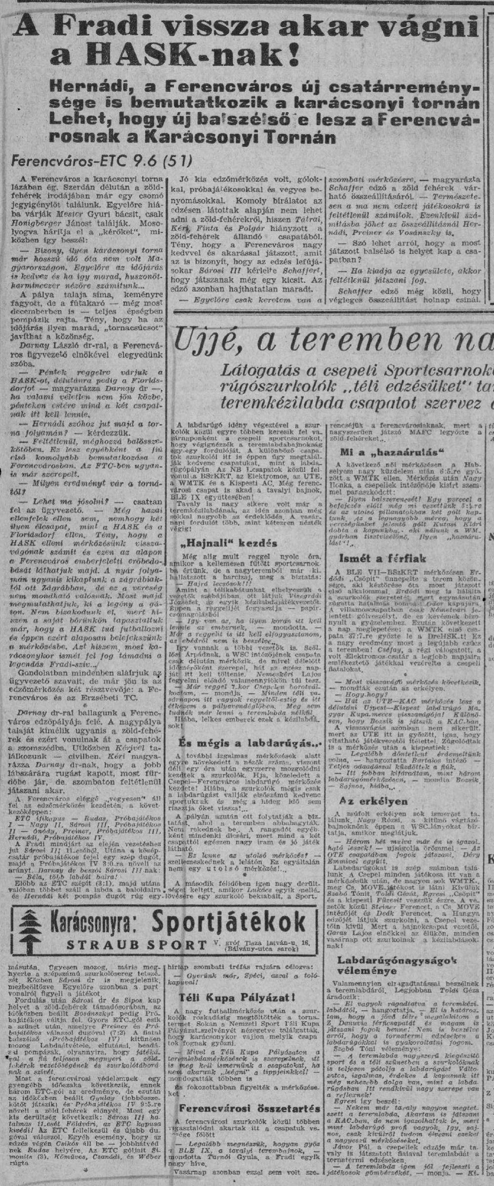 1943.XII.22. Ferencváros – Erzsébeti TC 9:6 (edzőmérkőzés)