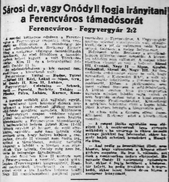 1944.IX.27. Ferencváros – Fegyvergyár 2:2 (edzőmérkőzés)
