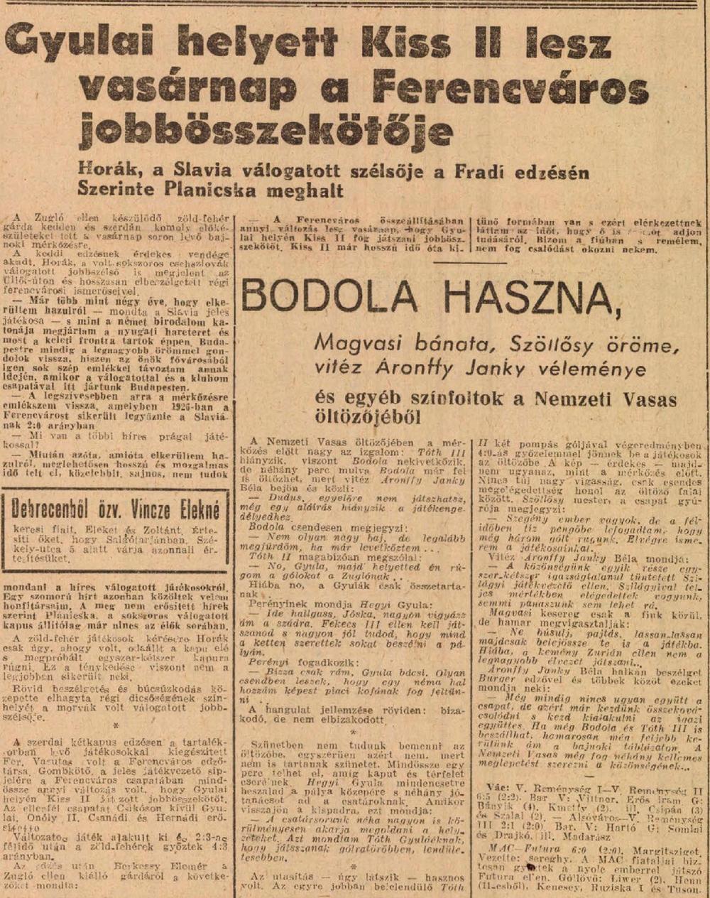 1944.XI.1. Ferencváros – Ferencvárosi Vasutas 4:3 (edzőmérkőzés)