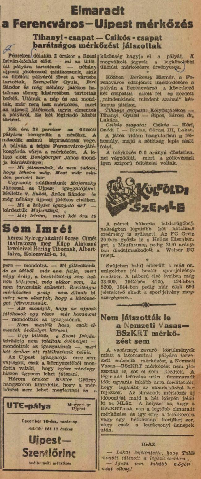 1944.XII.8. Ferencváros – Újpest – ELMARADT