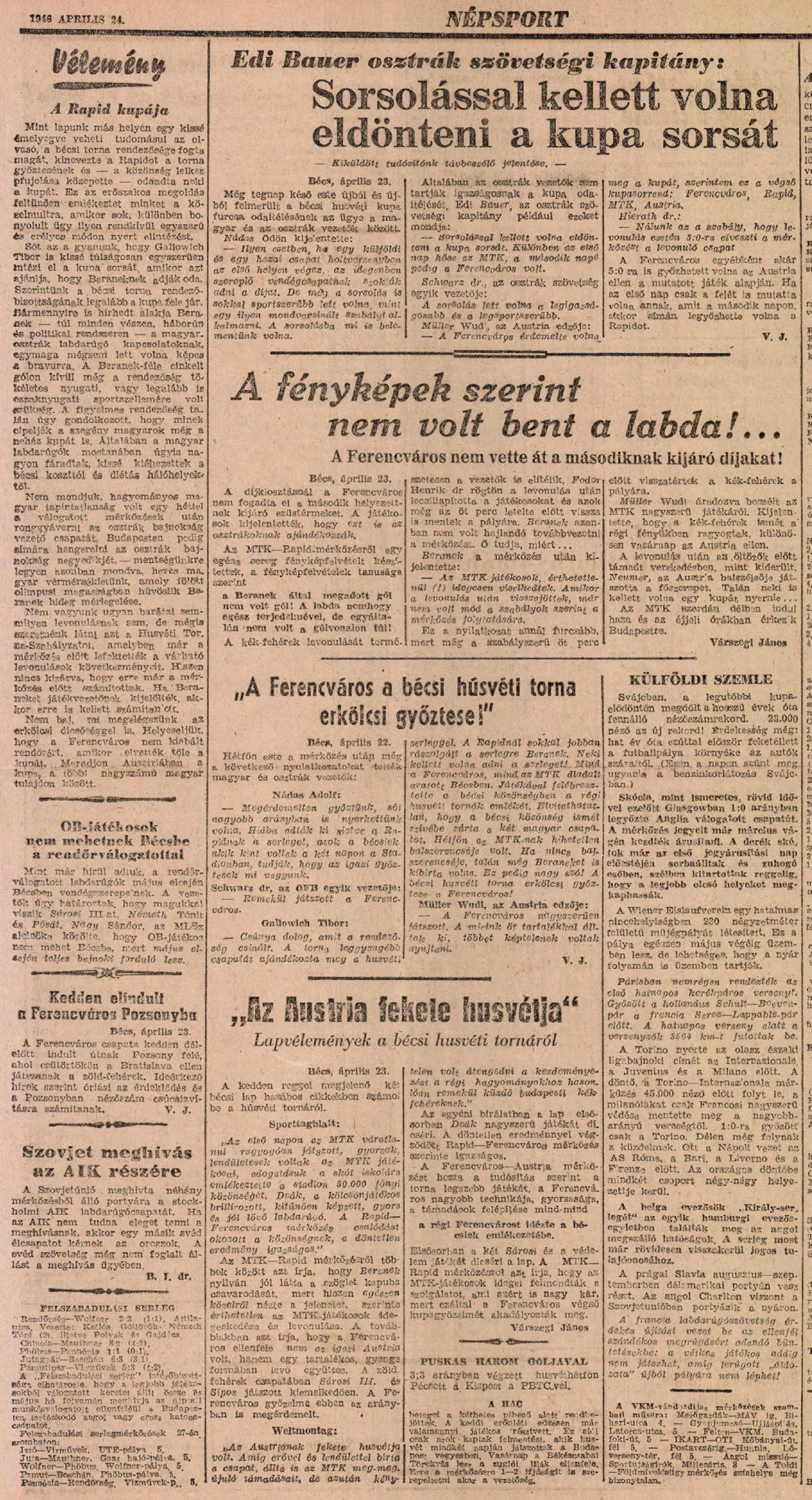 1946.IV.22. Húsvéti torna, Austria – Ferencváros 1:3