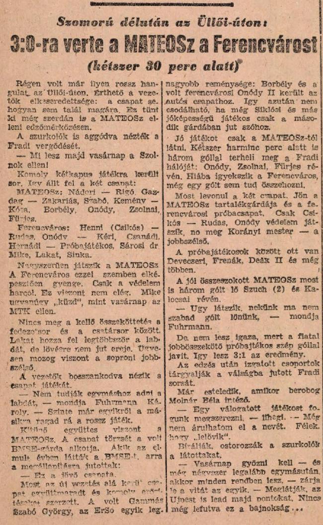 1946.IX.11. Ferencváros – MATEOSZ 0:3 (edzőmérkőzés)