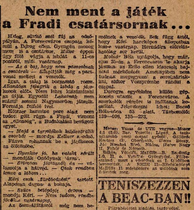 1947.III.12. Ferencváros – Budakalász 0:1 (edzőmérkőzés)