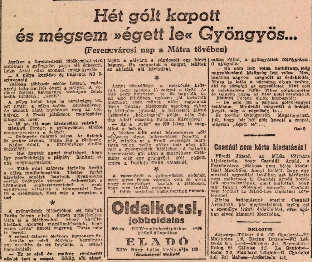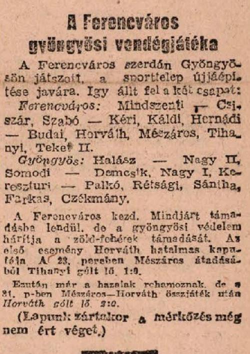 1948.IX.15. Gyöngyös – Ferencváros 2:7 (edzőmérkőzés)