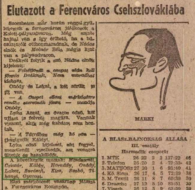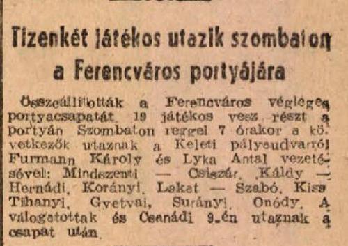 Összeállították a Ferencváros végleges portyacsapatát 12 játékos vesz részt a portyán. Szombaton reggel 7 órakor a következők utaznak a Keleti pályaudvarról Furmann Károly és Lyka Antal vezetésével: Mindszenti — Csiszár, Káldy — Hernádi, Korányi, Lakat — Szabó, Kiss, Tihanyi, Gyetvai, Surányi, Onódy. A válogatottak és Csanádi 9-én utaznak a csapat után.