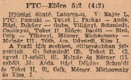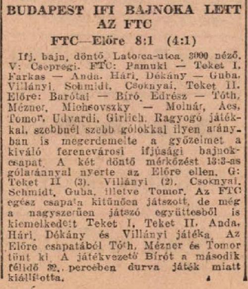 1948.VIII.21/22. FTC – Előre 5:2 és 8:1 Közzétéve: 2009. február 17. kedd | Szerző: K@rcsi BUDAPEST IFI BAJNOKA LETT AZ FTC 1948.VIII.22., Ifjúsági döntő: FTC – Előre 8:1 (4:1) 1948.VIII.21., Ifjúsági döntő: FTC – Előre 5:2 (4:2) Vélemény, hozzászólás? Válasz megszakításaAz e-mail címet nem tesszük közzé. A kötelező mezőket * karakterrel jelöltük Hozzászólás * Név * E-mail cím * Honlap Δ