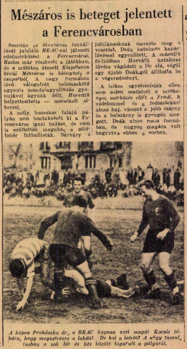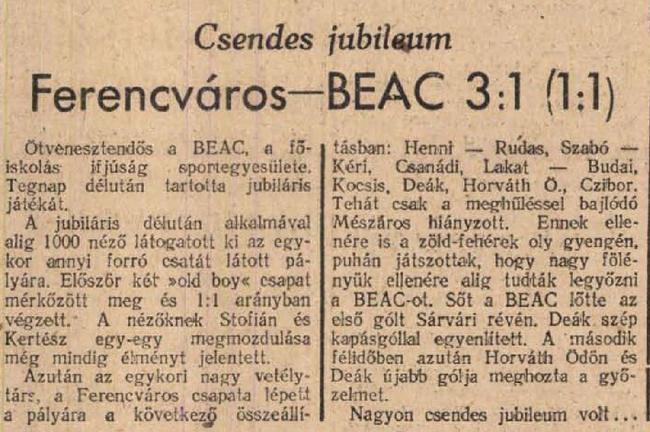 1948.X.27. Jubileumi mérkőzés, BEAC – Ferencváros 1:3 Közzétéve: 2009. február 17. kedd | Szerző: K@rcsi Egy hozzászólás a(z) 11110011100ejegyzéshez admin on 2024. november 5. kedd - 14:02 A Ferencváros szerdán délután 3 órai kezdettel a BEAC Mező-uti pályáján barátságos mérkőzést játszik az 50 éves fennállását ünneplő BEAC csapatával. Népsport, 1948. október 25. Vélemény, hozzászólás? Válasz megszakításaAz e-mail címet nem tesszük közzé. A kötelező mezőket * karakterrel jelöltük Hozzászólás * Név * E-mail cím * Honlap Δ