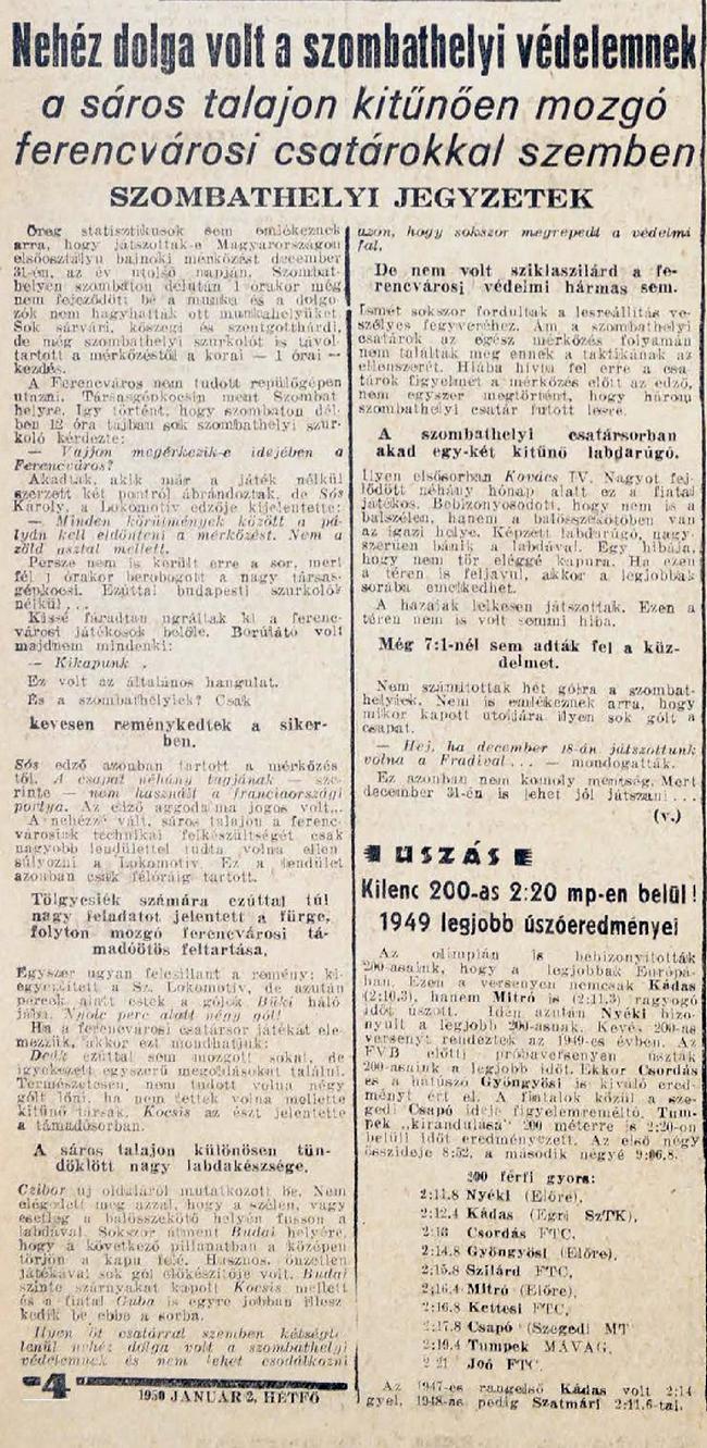 Nem gondoltam volna, hogy ilyen nehéz lesz bevezetőt írnom a mai muzeális bajnoki beharangozóhoz. Adatbázisunkból könnyű lett volna választani, de valahogy a sors úgy akarta, hogy addig keresgéljek, amíg nem találok rá az 1949. december 31-i Szombathely-Ferencváros mérkőzésre. Először még egy 1958-as találkozó bemutatása volt a terv, hiszen akkor a Szombathely hátvédsorában szerepelt egy játékos, aki néhány évvel később a Ferencvárosi labdarúgás egyik legjelentősebb egyénisége lett: Novák Dezső. Kezembe akadt egy 1936-os újság is, és mivel mindig is „vonzódtam” a harmincas évek Ferencvárosához, az akkori 3:2-s győzelemmel végződő összecsapás is esélyes volt a beharangozóra. De a sors nem engedte azt, hogy „könnyebb vizekre” evezzek.