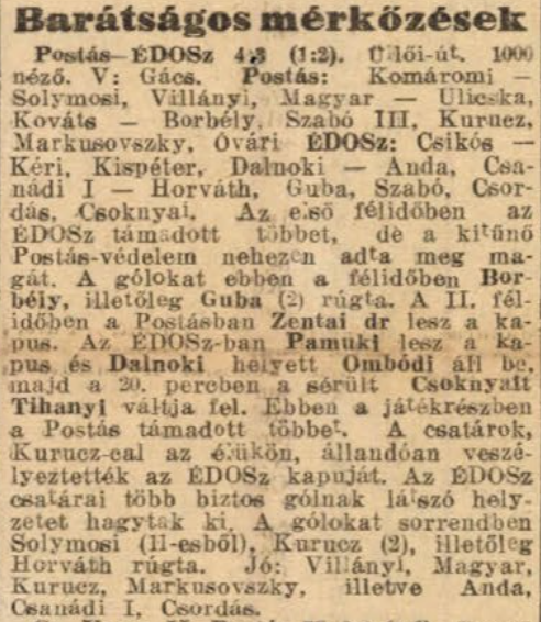 1950.XI.12. ÉDOSZ – Postás 3:4 (edzőmérkőzés)