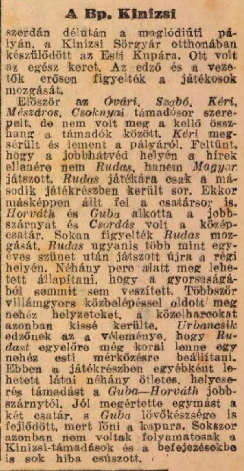 „A Kinizsi szerdán délután kétkapus edzőmérkőzést játszik a Kinizsi Sörgyárcsapata ellen és az edzőmérkőzés alapján csütörtökön állítják össze a végleges csapatot.”