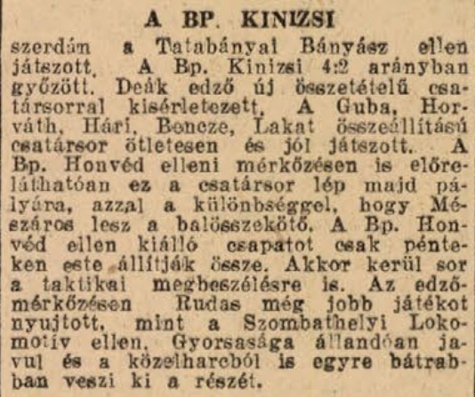 1952.III.26. Bp. Kinizsi – Tatabányai Bányász 4:2 (edzőmérkőzés)