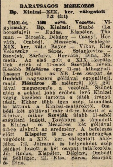 1952.VII.30. Bp. Kinizsi – XIX. ker. válogatott 7:2 (edzőmérkőzés)