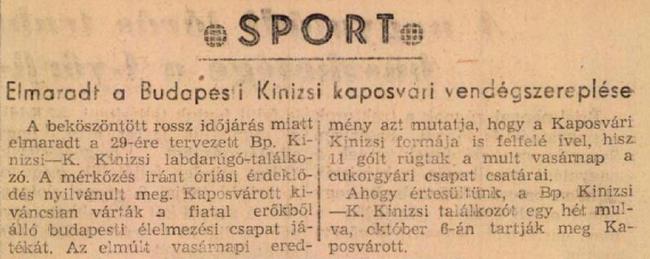 1954.IX.29. Kaposvári Kinizsi – Bp. Kinizsi (edzőmérkőzés) – ELMARADT