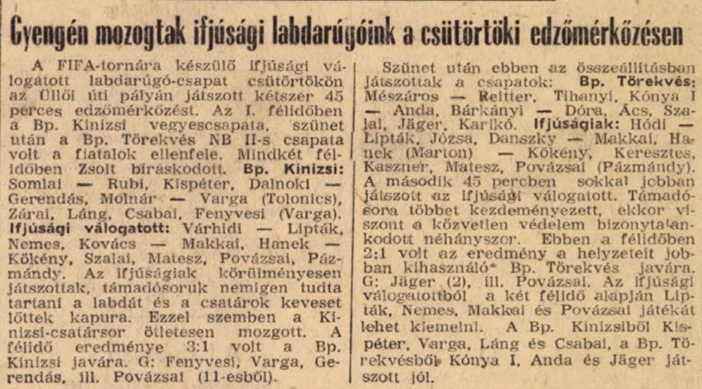 1956.II.23. Bp. Kinizsi – Ifjúsági válogatott 3:1 (edzőmérkőzés)