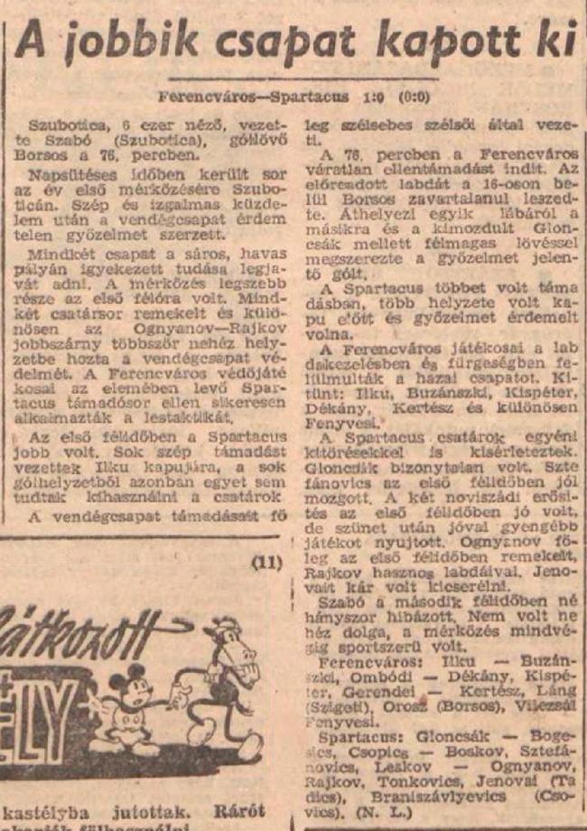 1957.I.2. Spartak Subotica – Ferencváros 0:1 Közzétéve: 2009. február 26. csütörtök | Szerző: K@rcsi Több gólt is lőhettek volna a zöld-fehérek Egy hozzászólás a(z) 11110100101ejegyzéshez Gunda Attila on 2022. február 6. vasárnap - 14:10 Ki volt ez az Onódi Lajos? Nem tudok róla semmit. Vélemény, hozzászólás? Válasz megszakításaAz e-mail címet nem tesszük közzé. A kötelező mezőket * karakterrel jelöltük Hozzászólás * Név * E-mail cím * Honlap Δ