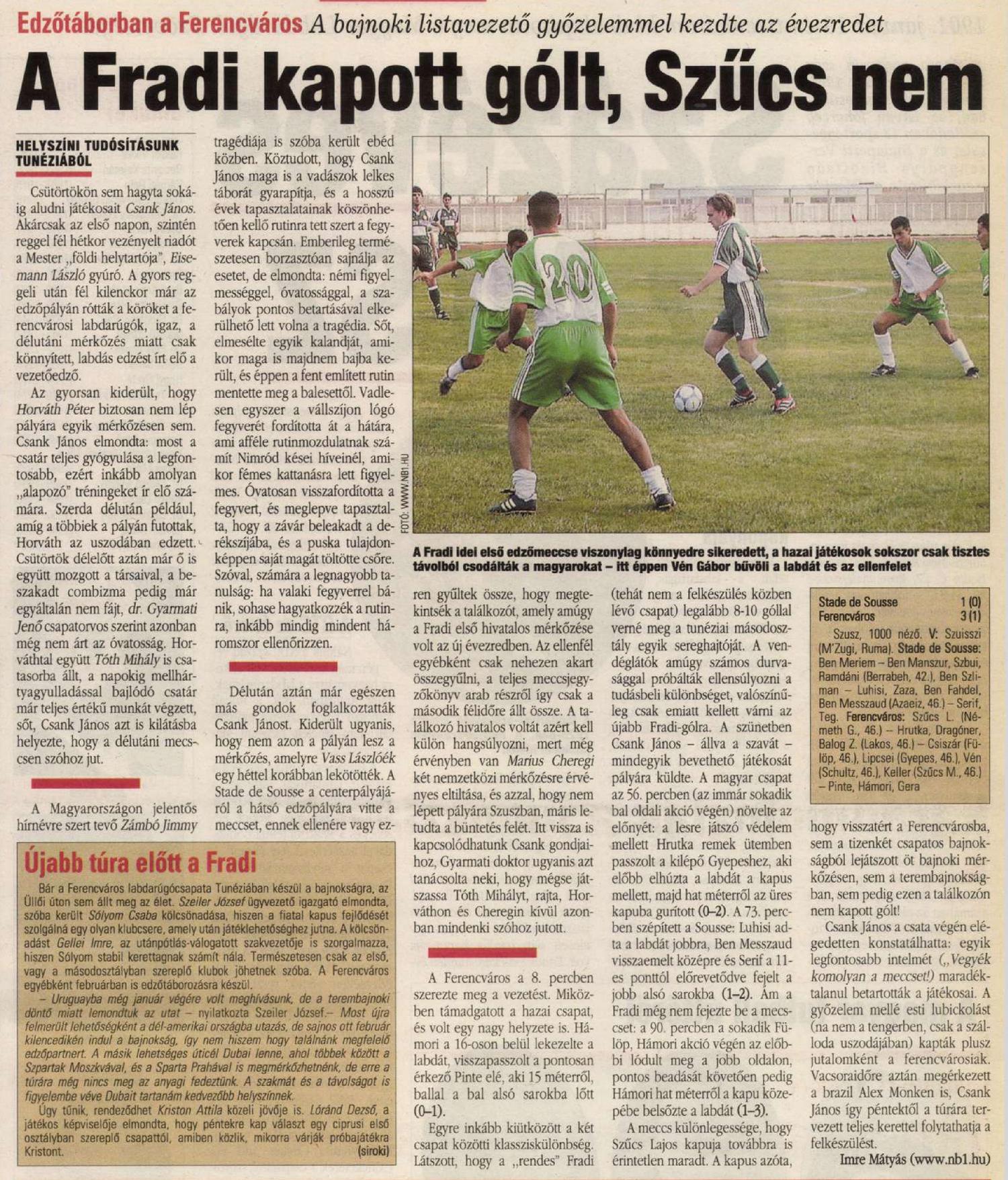 2001.I.18. Stade Sousse – Ferencváros: 1-3 Közzétéve: 2009. április 11. szombat | Szerző: K@rcsi Győzelemmel kezdett a Fradi A brazil csatár, Alex Arruda lekéste a soussei adzőmérkőzést Vélemény, hozzászólás? Válasz megszakításaAz e-mail címet nem tesszük közzé. A kötelező mezőket * karakterrel jelöltük Hozzászólás * Név * E-mail cím * Honlap Δ