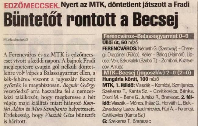 2001.VIII.14. Ferencváros – Balassagyarmat: 0-0 (edzőmérkőzés)