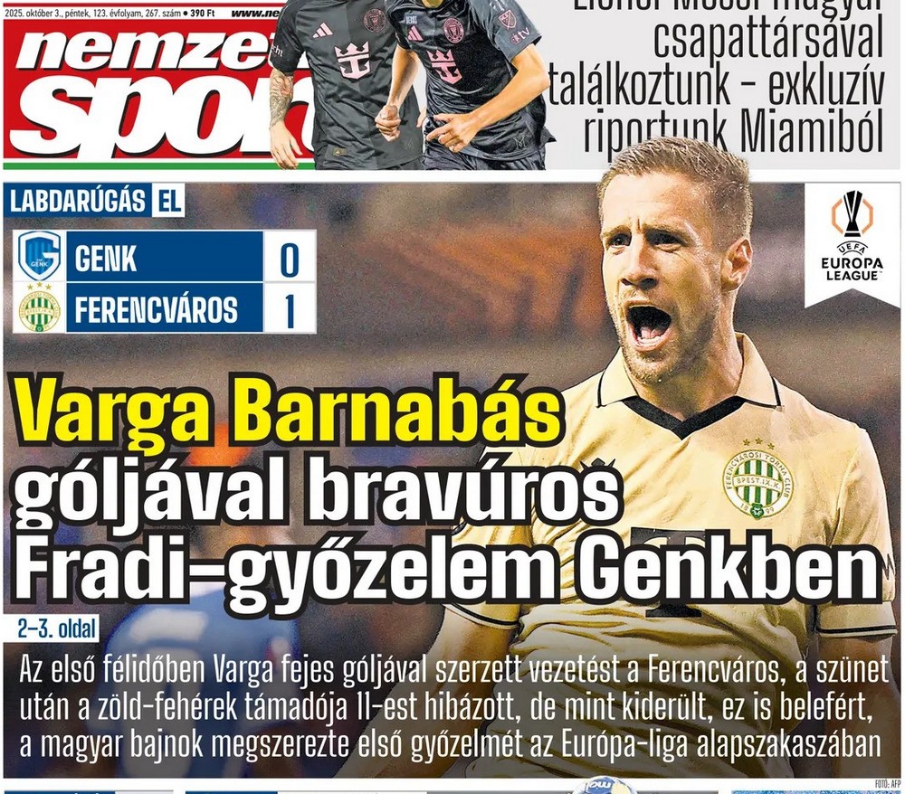 A labdarúgó Európa-liga alapszakaszának második körében a Ferencváros 1–0-ra győzött belga Genk otthonában. Varga Barnabás az első félidő végén fejjel vette be a belgák kapuját, majd a második félidő elején tizenegyest hibázott. A Genk hiába támadott többet, a kapuba nem tudott betalálni, a Ferencváros idegenben szerezte meg első győzelmét az El-alapszakaszban.
