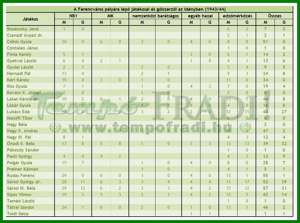 Ferencváros: Mezőfi – Tátrai, Polgár – Bosánszky, Csanádi, Lakat – Sipos, Kiss Gy., Sárosi, Finta, Gyetvai