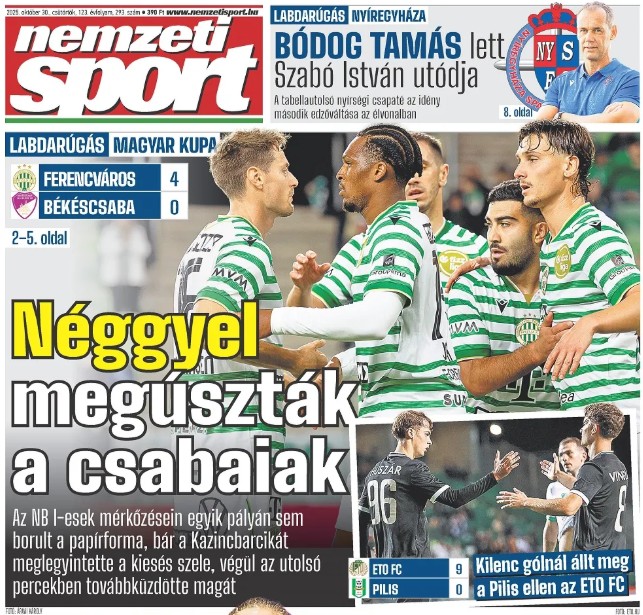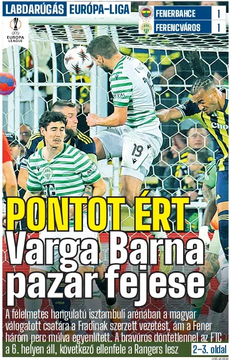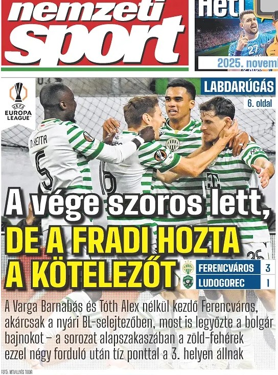 A labdarúgó Európa-liga alapszakaszának 4. fordulójában a Ferencváros hazai pályán 3–1-re legyőzte a bolgár Ludogorecet. Kanikovszki góljával a 31. percben szerezték meg a vezetést a zöld-fehérek, majd az 53. percben Cadu góljával nőtt az előny. A hajrában szépítettek ugyan a bolgárok, de az FTC megszerezte a harmadik gólját – sorozatban harmadik győzelmével a Ferencváros karnyújtásnyira került a továbbjutástól.