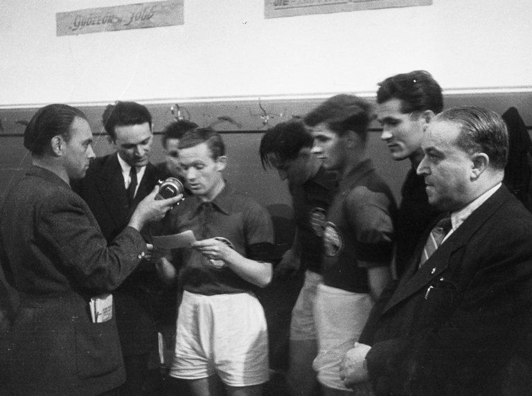 Állnak (balról): Puskás, Lakat, Kocsis S., Budai, Szusza, Bozsik, Rudas, Börzsei, Deák, Henni