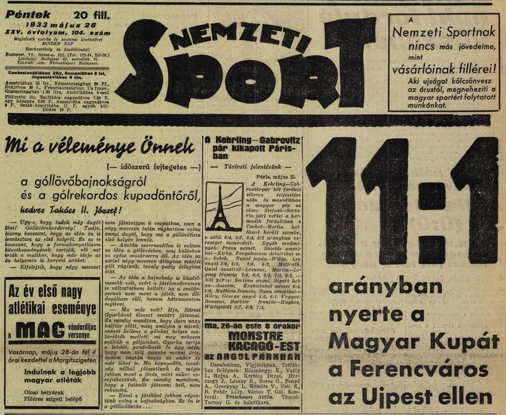 1933.V.25. MK Döntő, Ferencváros – Újpest 11:1