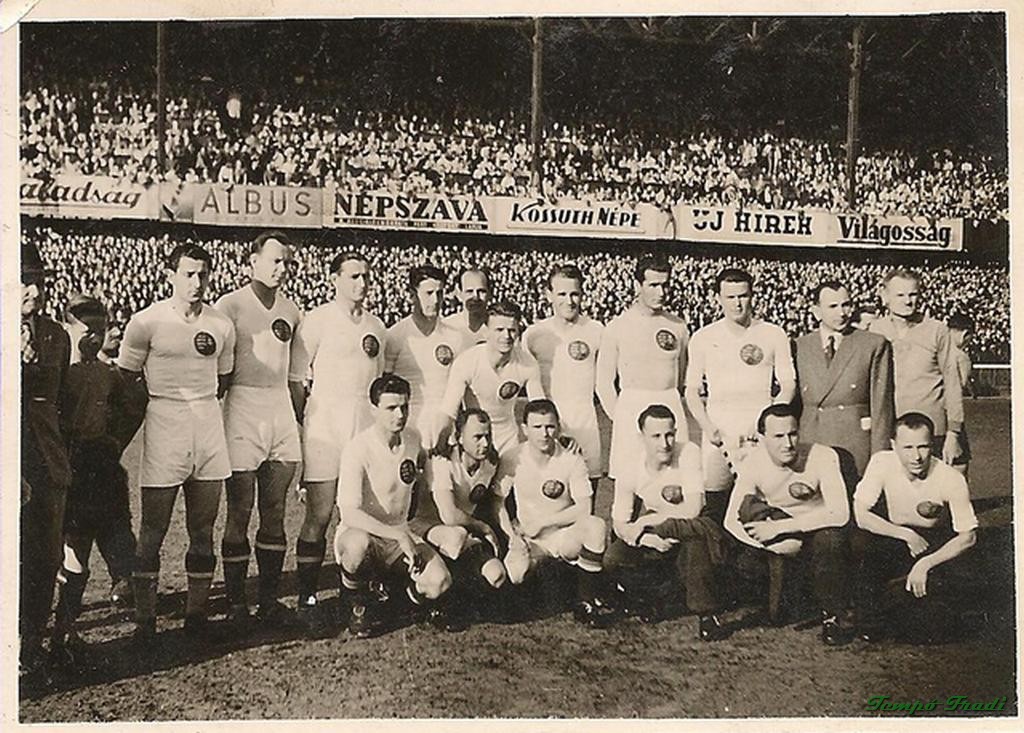 B tribün, ÁLL: Rudas, -, Szűcs, Bozsik, Sipos, Kónya, – , Szusza,