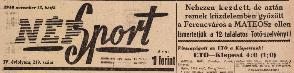 1948.II.29. Ferencváros – MATEOSZ 2:0 Közzétéve: 2009. február 17. kedd | Szerző: K@rcsi A nehéz talajon is biztosan győztek a hosszú labdákkal játszó zöld-fehérek. Egy kattintás ide a folytatáshoz.... →